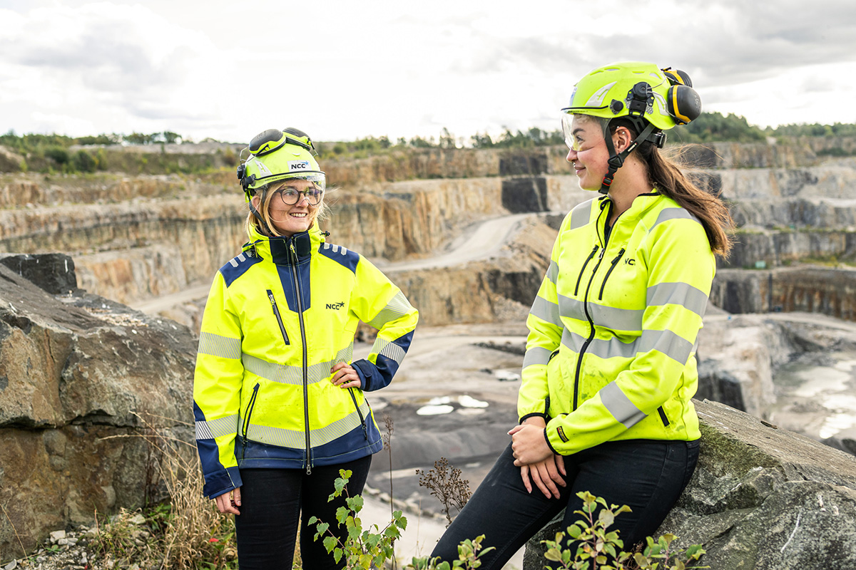 Amanda och Hanna jobbar på NCC:s största och mest moderna bergtäkt. Den ligger i Södra Sandby utanför Lund, ett av få områden i Malmö-Lundregionen där det finns tillgång på tillräckligt bra berg för att tillverka stenmaterial till allt som byggs. Amanda började som trainee för några år sedan och arbetsleder nu åtta personer, en av dem är Hanna som kör lastare.