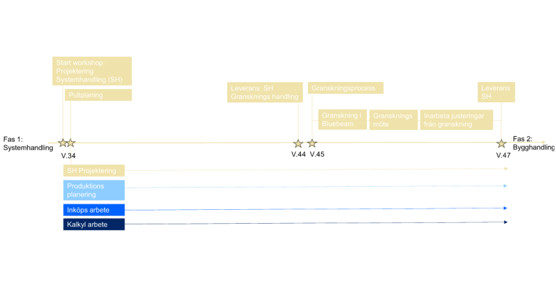 Min första rotation inom projektet var inom projektering där jag gick som biträdande projekteringsledare för Hus. Det som var speciellt i denna rotation var att jag fick möjlighet att vara med genom hela processen. Från startmöte till överlämning av färdig Systemhandling som pågick under 14 veckor. (Om du är intresserad av se närmare hur de olika stegen i projekteringen såg ut, klicka på bilden).