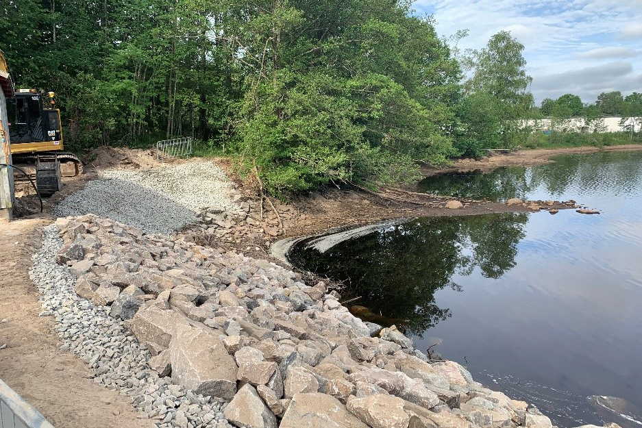 Förra gången jag skrev här på bloggen var jag på en rotation som anbudsingenjör i Karlskrona. Nu är jag sedan ett par månader tillbaka på ett projekt i Markaryd i Småland. Här förstärker vi en damm på uppdrag av Statkraft. När jag först kom hit visste jag inte speciellt mycket om hur en damm är uppbyggd. Dammens syfte är att höja vattenytan så att vattenkraft kan genereras. För att dammvallen ska fungera är den uppbyggd av en rad olika lager av massor i olika fraktioner. Det vi gör här i Markaryd, i stora drag, är att skifta ut de befintliga massorna mot nya samt förstärka vallen med en plastspont som vi betongfyllt.