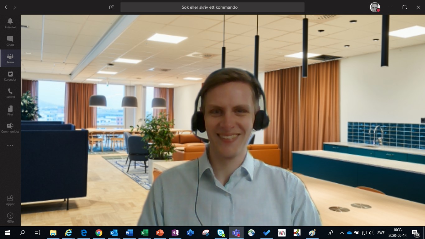En vanlig bild under de senaste veckorna med möte hemifrån via Teams. Som bakgrund i Teams skymtar en bild inifrån kontoret på Herrjärva. Med denna bakgrundsbild har flera kollegor frågat om jag suttit på kontoret när jag i själva verket arbetat hemifrån.