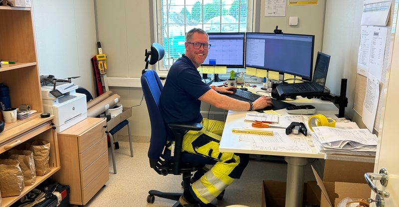 Platschef Nicklas med ovanligt få post-it-lappar på datorskärmen.