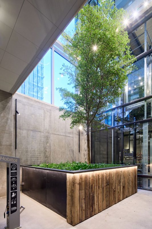 Men hur skapar vi det bästa cykelrummet? För att få svar på frågan vände vi oss till en cykelgrupp på Facebook. Det framkom bland annat att många kvinnor känner en otrygghet när de parkerar cykeln i en källare, och denna insikt kunde vi använda i vår egen utformning. Vi bestämde oss för att öppna upp bjälklaget i tre plan, vilket skapade kontakt mellan cykelparkeringen och entrén, som medförde plats för såväl ökad trygghetskänsla som ett fritt växande träd – ett av byggnadens signum.